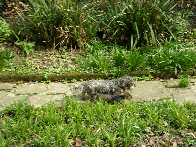 Mini zeigt Cumin den hinteren Garten und rauft mit ihm auf dem Rasen rum.