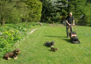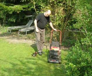 17.04.2009 Heute durften sie den Rasenmäher kennen lernen. Neben Mama kann man das Getöse aushalten. Um Chili mussten wir Slalom fahren.