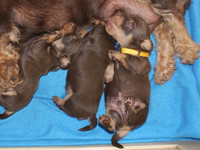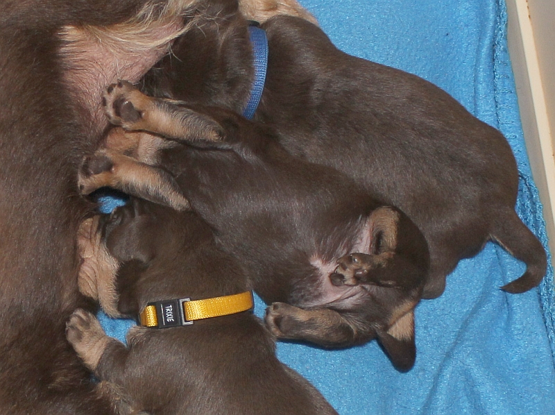 08.05.2011 Die erste Woche haben wir ohne Komplikationen rum bekommen. Die Welpen haben gut an Gewicht zugelegt und wiegen jetzt zwischen 394g und 507g.