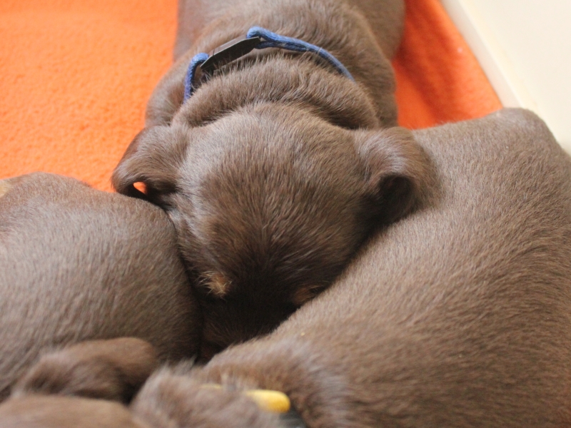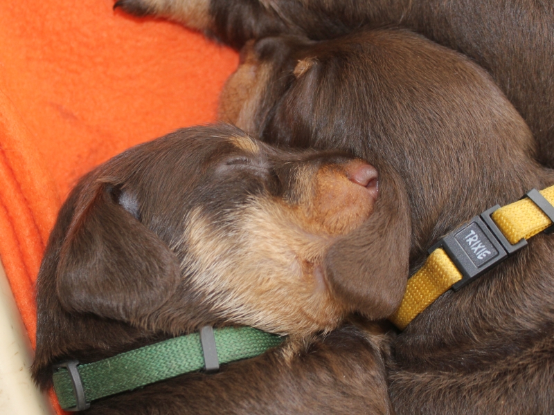 Das Kleebalt ist jetzt, mit drei Wochen, schon soo aktiv. Die Nase wird in tiefe Schluchten gesteckt. Der Kopf auf riesige Hügel gelegt. Dem Kumpel wir was geflüstert. Es wird seelig von riesigen Knochen geträumt.