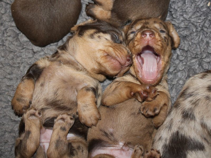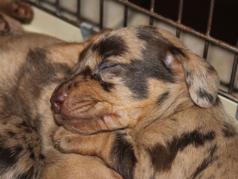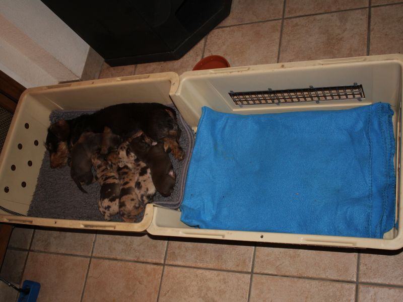Jetzt mit offenen Äuglein werden die Kleinen schon deutlich unternehmungslustiger sodass wir angebaut haben. Die große Hündin hat sich als erste getraut die neue Kiste zu begutachten.